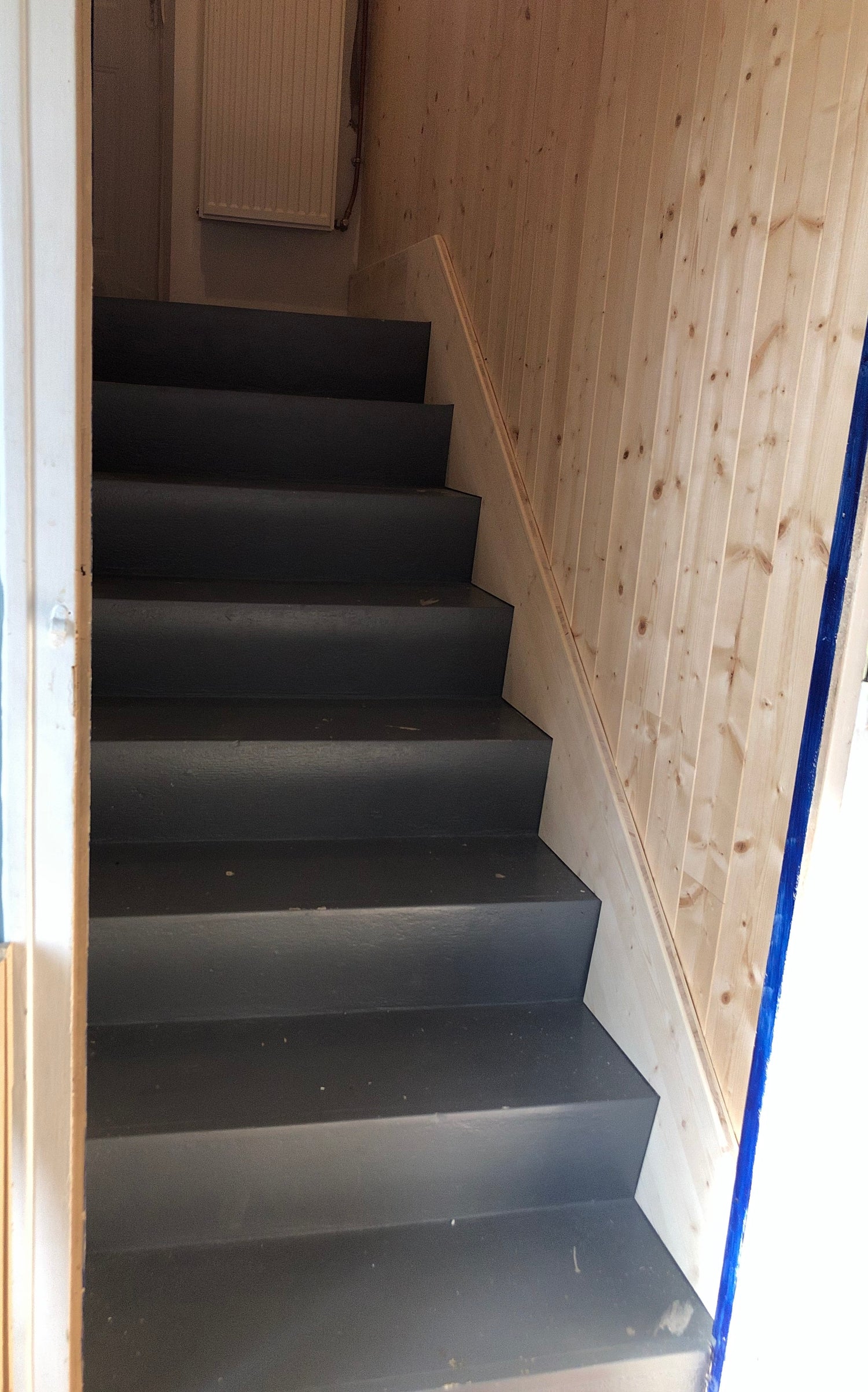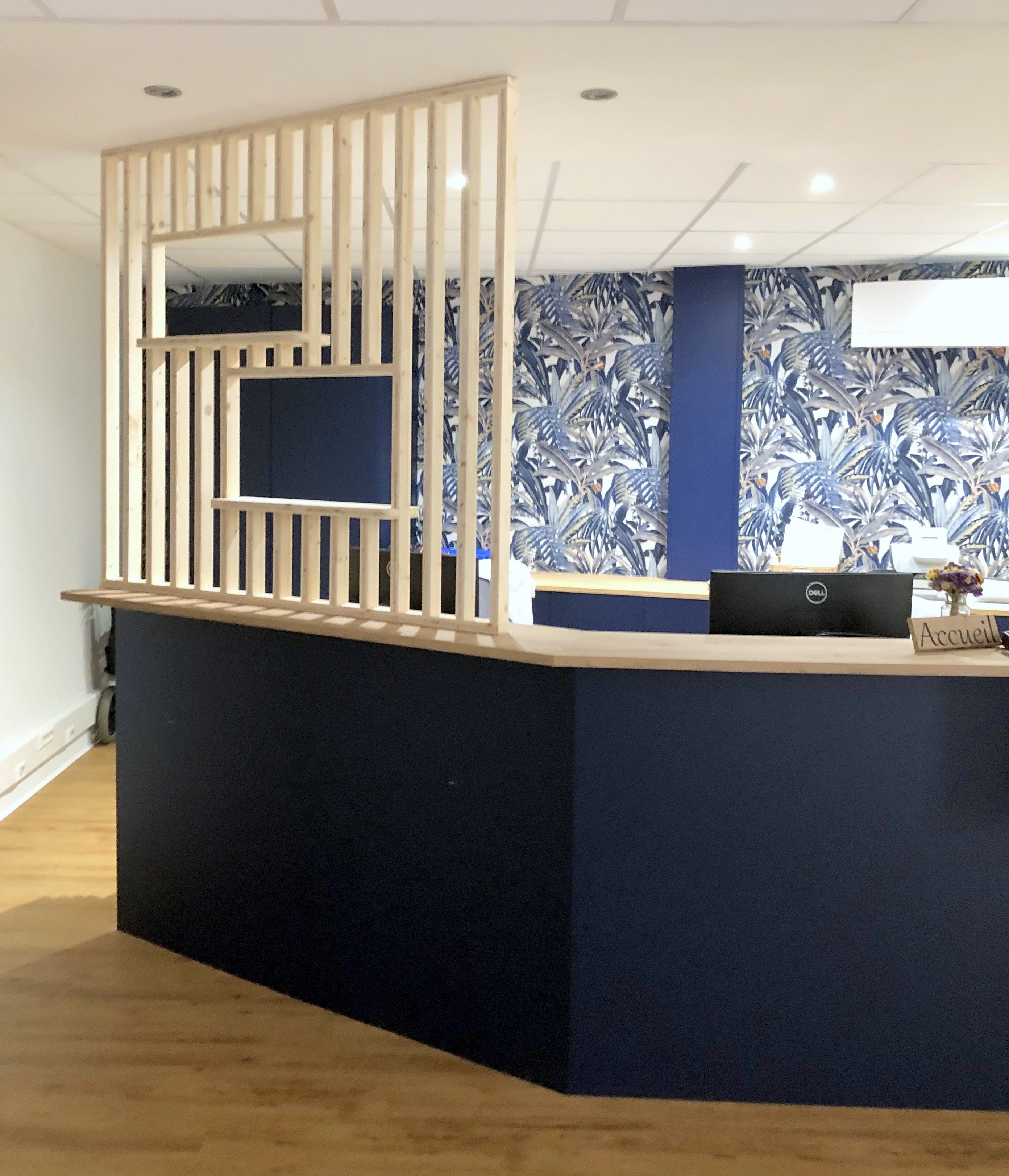 Réalisation de la banque d'accueil en MDF et covering bleu