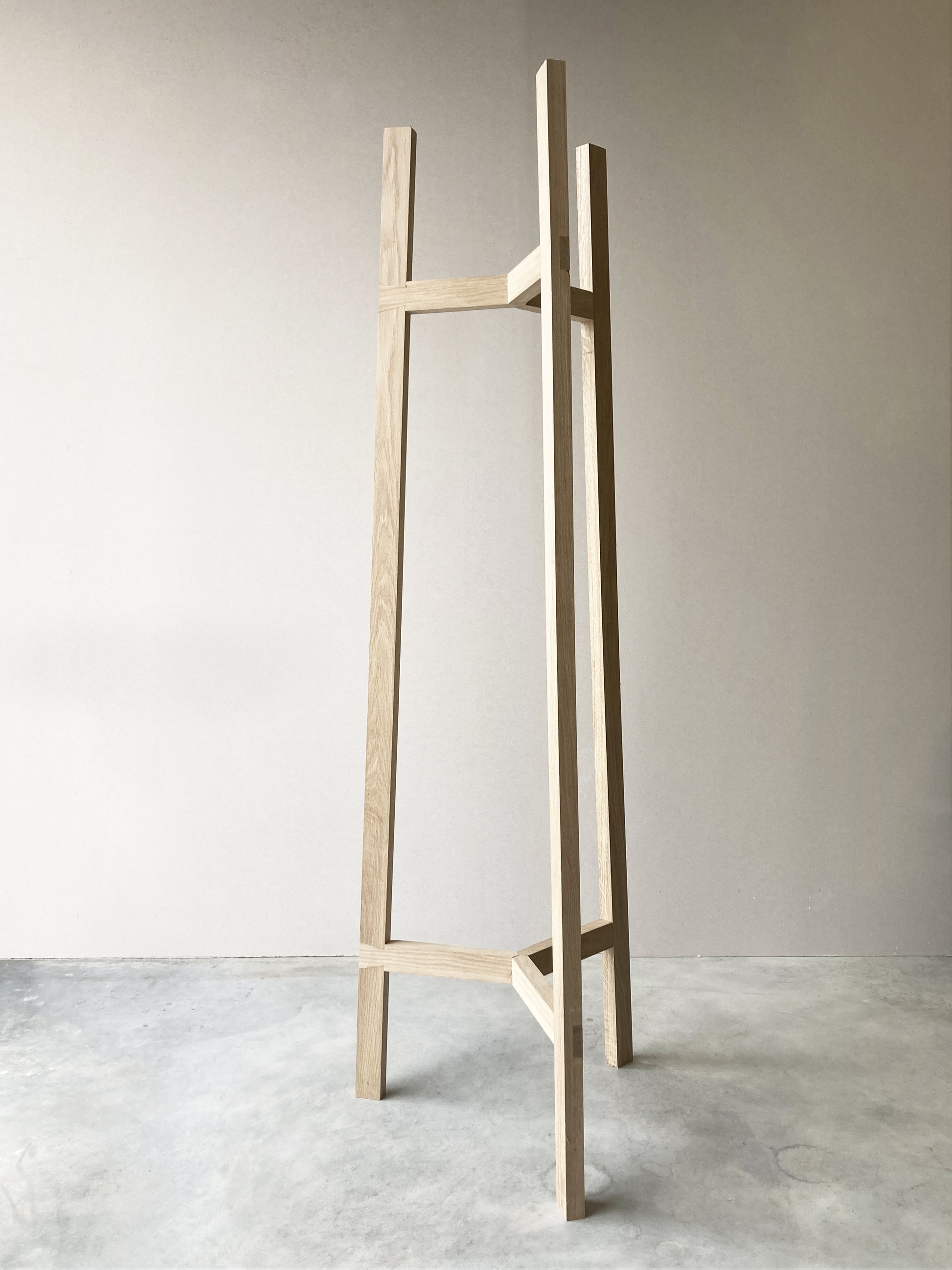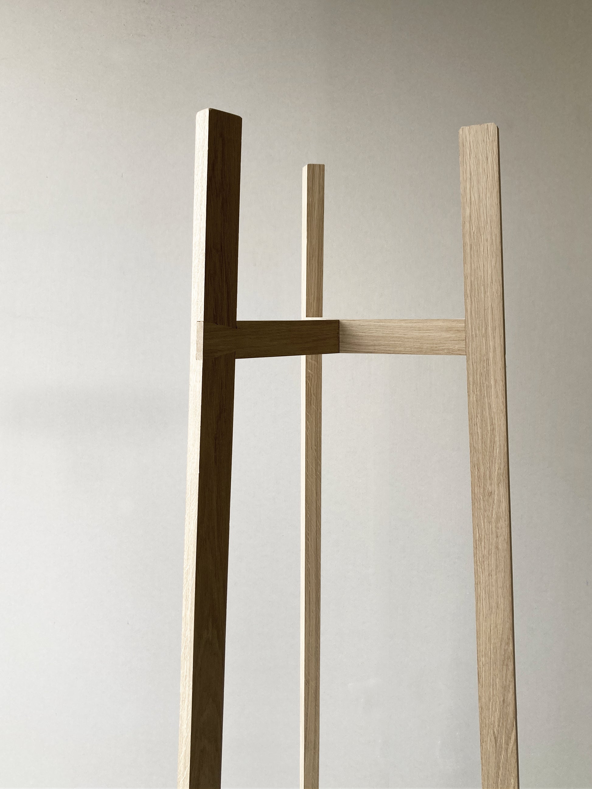 La conception sur la base de tasseaux de chêne à l'assemblage singulier et de base triangulée qui donne une grande stabilité à l'objet.